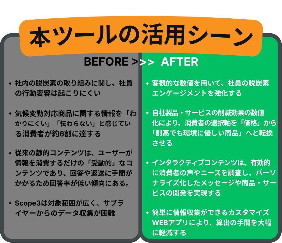 ・自社製品・サービスの削減効果の数値化により、 消費者の選択軸を「価格」から「割高でも環境に優しい商品」へと転換させる